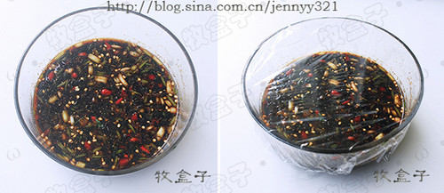 4.将处理好的辅料放入盆中,倒入酱油,加十三香、 干贝素(或鸡精)搅匀,戴上一次性手套,不停地搓揉辅料5分钟,使其汁液充分融入酱油中,覆盖上保鲜膜冷藏浸泡5小时以上即可取用。