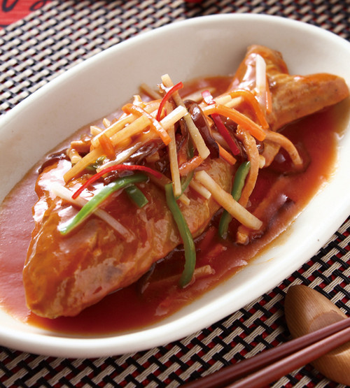 4. 续以太白粉水勾芡,最后再淋在作法1的素鱼上即可。