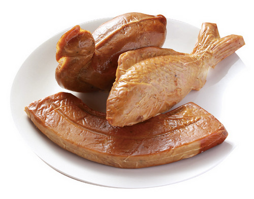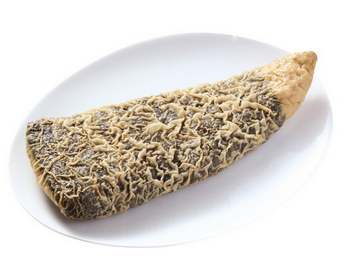 如果不强调外型的相似,这种用腐皮、海苔制成的素鱼,在口味上味道更佳,食用时可切片,料理变化更具多样性。