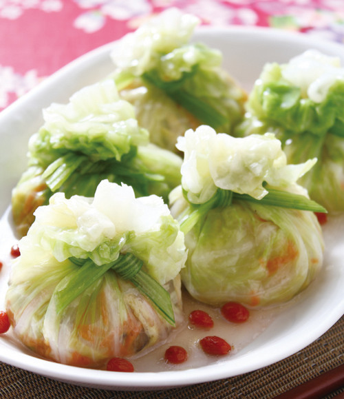 3. 取一片作法1的高丽菜叶铺平,放入适量作法2的馅料,再用作法1的芹菜梗绑好,将多余的高丽菜叶和芹菜梗修剪至齐。