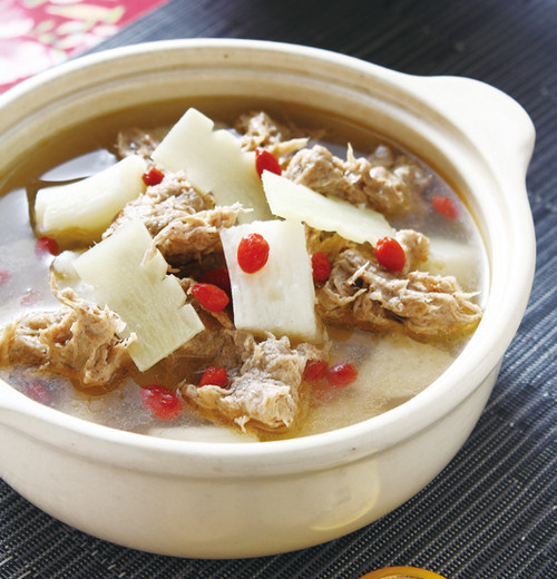 素羊肉200公克、山药400公克、姜片15公克、枸杞10公克、水1200cc