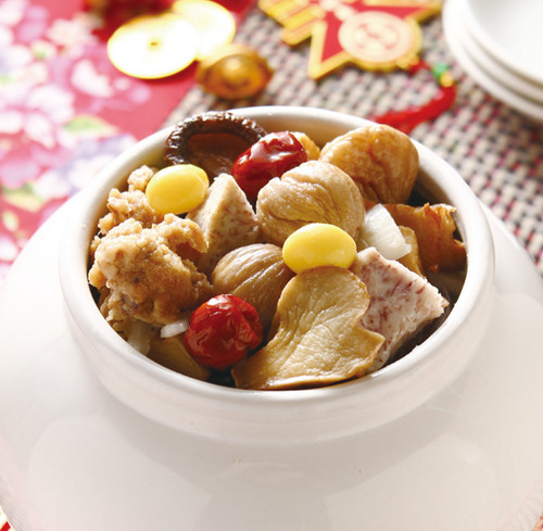 1. 香菇洗净泡软沥干;栗子泡软去多余皮;芋头去皮洗净切块;素肚洗净切块;红枣洗净;白果、脆笋泡水2小时,放入滚水汆烫捞起备用。