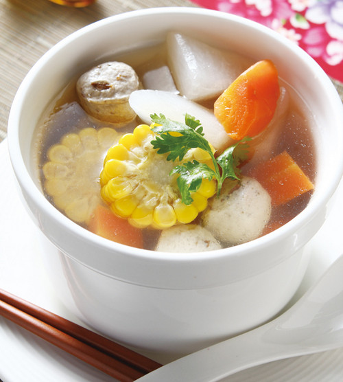 白萝卜 400公克、红萝卜 150公克、玉米 1条、素香菇丸150公克、水1300cc、香菜适量