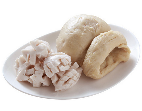 用蒟箬作成的素腰子,吃起来有脆脆的口感,用麻油爆姜片,一样可享用麻油素腰子。素肚是面粉制品,清炒或红烧都很够味。