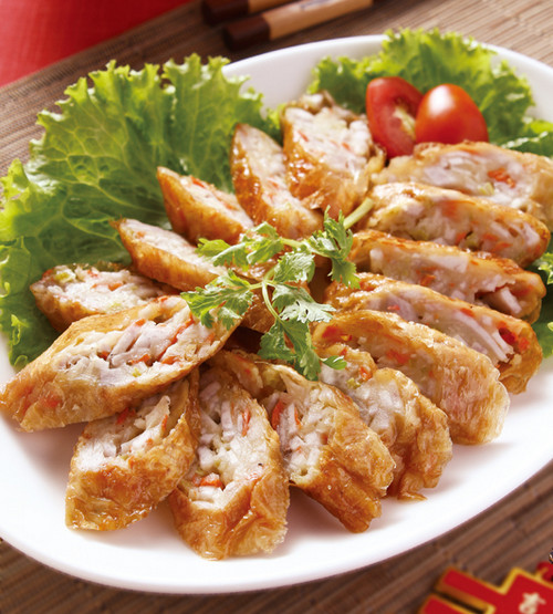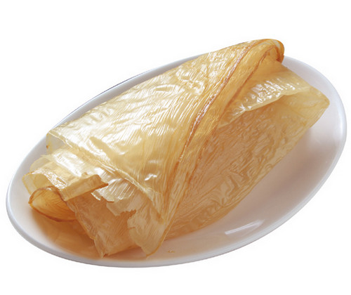 腐皮是以黄豆制成的豆浆,煮制加热过程中表面凝结的一层皮,再加工晒干而成的。一般在市面上看到的都是大张半圆形的,使用时按需要的大小裁剪。包入素馅料,油炸后即为素鸡卷。