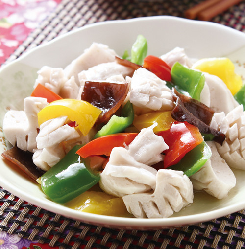 腰花300公克、红甜椒70公克、黄甜椒60公克、青椒60公克、黑木耳50公克、姜片10公克