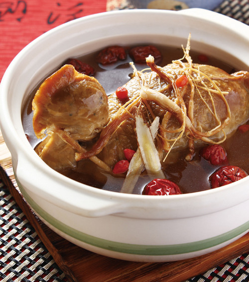 2. 将素鸡放入电锅内锅中,加入作法1的中药,再加入米酒,倒入水,放入电锅中。