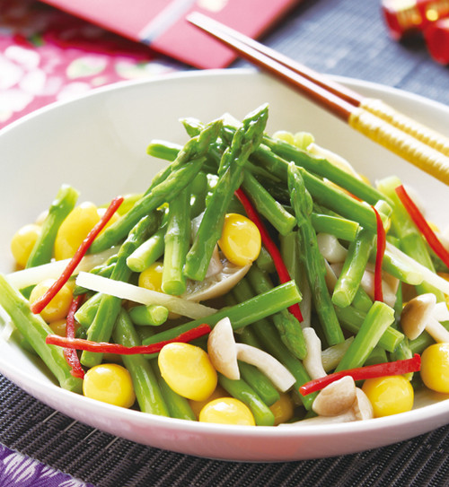 白果 60公克、青芦笋300公克、鸿喜菇50公克、姜片10公克、辣椒丝10公克