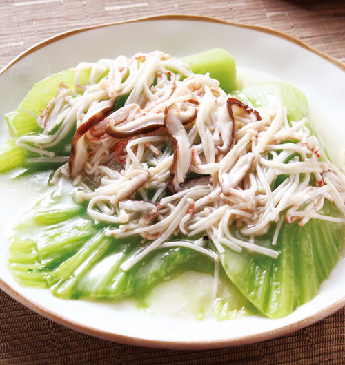 芥菜 500公克、金针菇 40公克、素蟹肉丝15公克、姜末5公克、鲜香菇1朵、水 300cc、太白粉水 适量