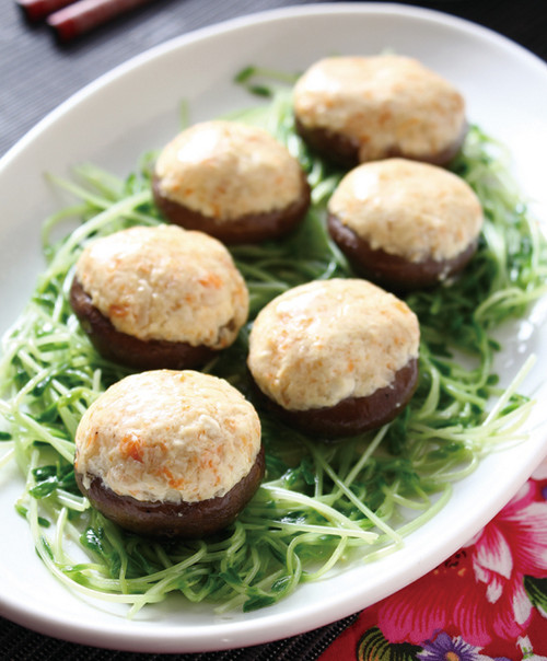 3. 将作法1的鲜香菇抹上少许太白粉,再取适量作法2的内馅填入,重覆此作法直到材料用尽,再放入蒸笼蒸10~15分钟。