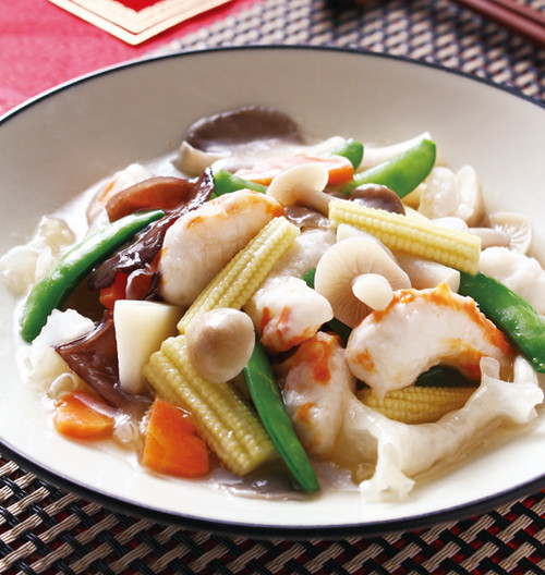 看起来几可乱真的素海鲜,是用蒟箬、大豆制品,再加入食用色素作成的。利用素海鲜,生菜素虾松、凤梨素虾球,或是煮素海鲜火锅都不是问题。