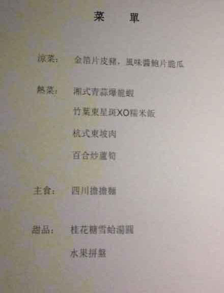 凉菜是两道,分别是金箔片皮猪,风味酱鲍片脆瓜。热菜有4道,分别是湘式青蒜爆龙虾、竹叶东星斑XO糯米饭、杭式东坡肉和百合炒芦笋,主食是四川担担面。甜品两道,分别是桂花糖雪蛤汤圆和水果拼盘。