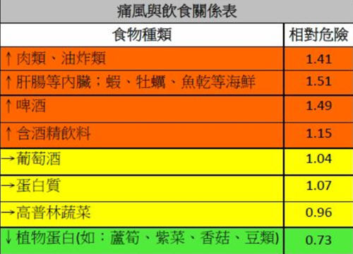 另一方面,有些民众误以为黄豆的普林含量较高,容易引起痛风。侯玟伊营养师表示,根据2004年发表于《新英格兰医学期刊》(NEJM)的研究指出,属于植物蛋白的豆类,引发痛风的相对危险性是0.73(如下表所示),比起摄取大量肉量及油炸食物来说,其实相对安全。因此,一般民众只要均衡饮食,不必过度担心吃黄豆会摄取过多普林。