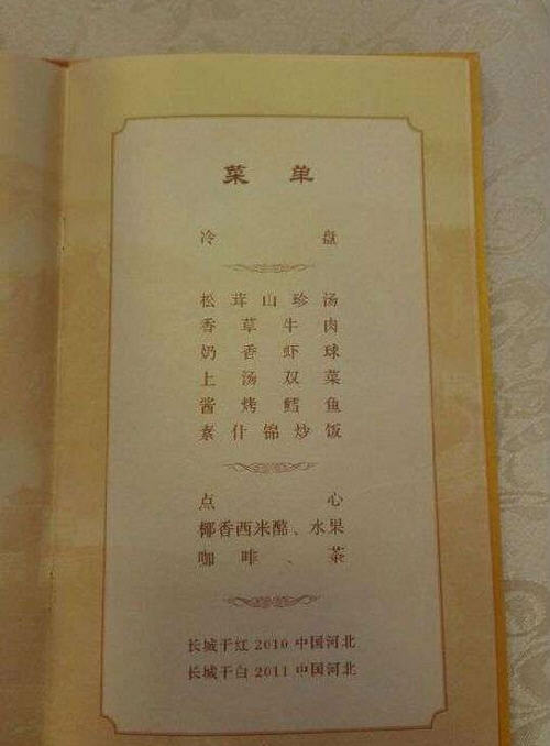 菜单包括:冷盘、松茸山珍汤、香草牛肉、奶香虾球、上汤双菜、酱烤鳕鱼、素什锦炒饭。此外,中国还为出席上午纪念活动的贵宾提供了点心、椰香西米露、水果、咖啡、茶。酒品包括长城乾紅2010、长城干白2011。
