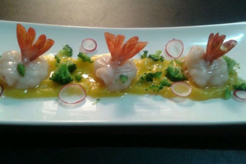 1、把虾去壳留尾,加白葡萄酒,胡椒,盐腌制五分钟,虾背去虾线,在虾身中开一刀,把虾尾穿过做成虾球。