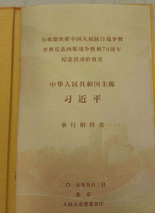 2015年9月3号上午抗战胜利70周年纪念日结束全,习主席招待外宾用餐,在此抗战胜利70周年的纪念日国宴菜单爆光了,里面都是一些看似平常且显得大气的菜肴,有牛肉,鱼,汤,水果等。