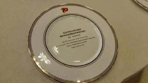 组织方还专门定制了主题纪念餐盘,餐盘上用中英文写上“纪念中国人民抗日战争暨世界反法西斯战争胜利70周年北京:2015年9月3日”,并打上此次纪念活动的Logo。