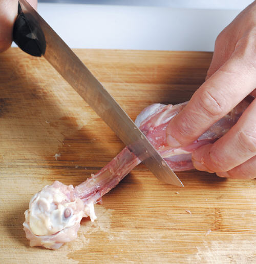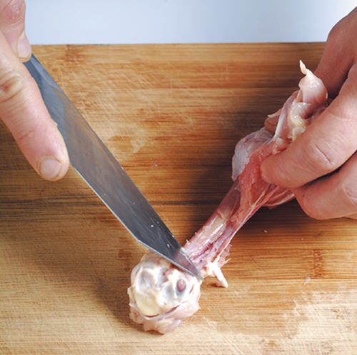 2 将骨头附近的筋剔除,由下往上将鸡腿骨拉出。