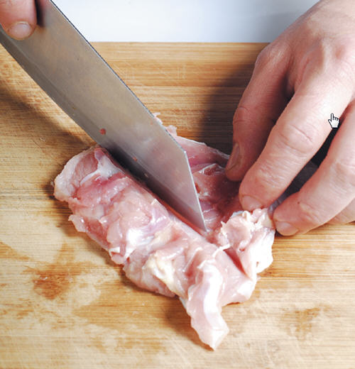 4 最后将取下的鸡腿肉内面的筋划断,避免加热时收缩变形。