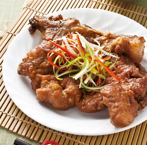 猪肉排2片(约240公克)、蒜泥15公克、地瓜粉40公克、红葱40公克、姜30公克、蒜仁40公克、八角10公克、花椒5公克