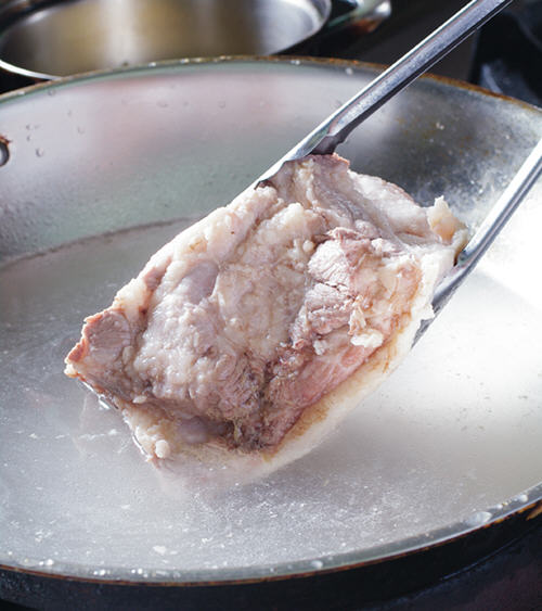 1、 将五花肉洗净,放入滚水中煮约20分钟后捞起(高汤留用)。