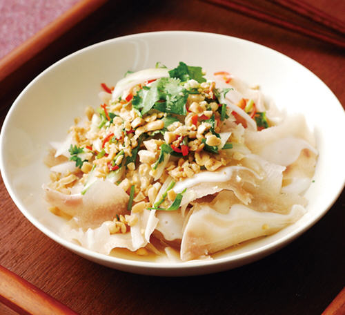 4、将作法3的酱汁淋至作法2的猪头皮片上,再撒上碎花生,食用时拌匀即可。
