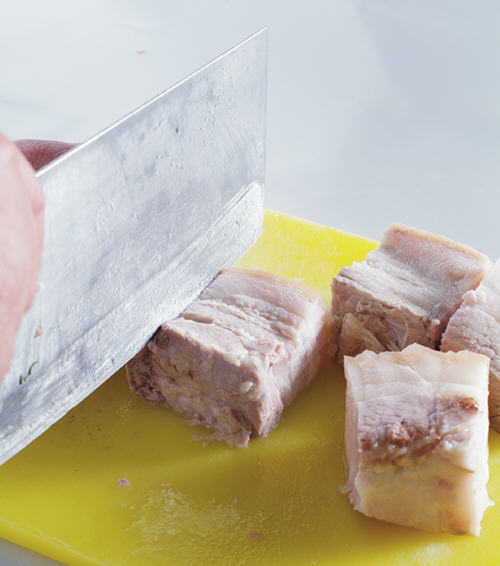 2、 将作法1的五花肉切块,修整成正方形块状。