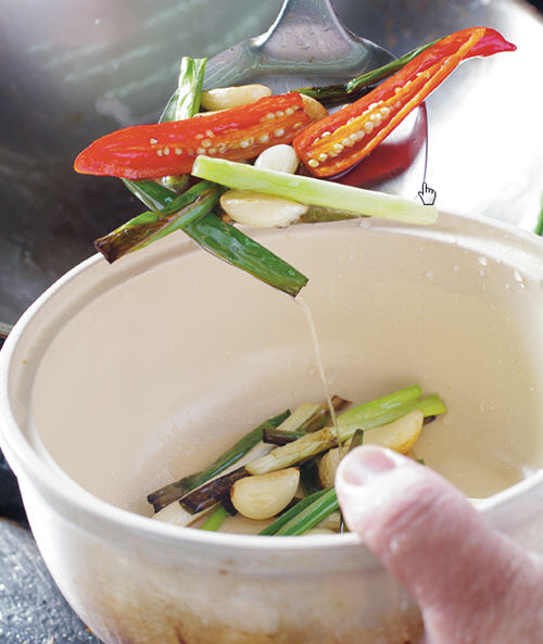 4、 热油锅,放入葱段红辣椒、蒜仁、姜片炒香,再移入炖锅中。