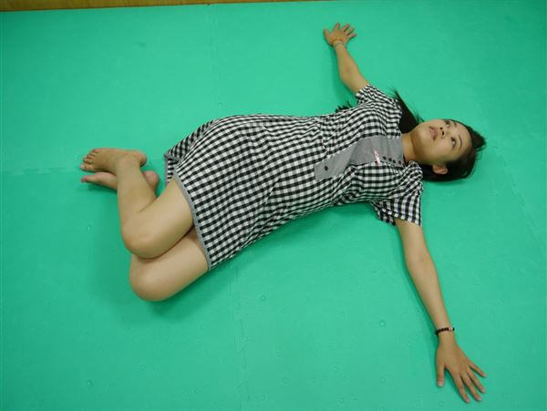 仰躺姿势下,双手往外平展,双膝弯曲、脚掌平放在床上。维持上身不动,双膝带至右侧贴倒至床面,反方向重复动作。可放松腰部肌肉。
