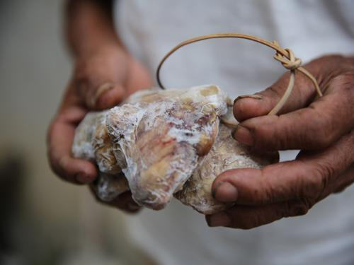 28日,占老汉从冰箱里拿出一块馒头大小的椭圆形灰白色物体便显露出来,表面因为有多数笔者用手摸了一下,感觉它的质地很坚硬,像是干了的面团。