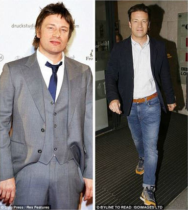 英国知名主厨杰米·奥立佛(Jamie Oliver)于2010年时身形较丰腴(图左),今年5月时(图右)看起来比较苗条。(图片/取材自《每日邮报》Daily Mail)