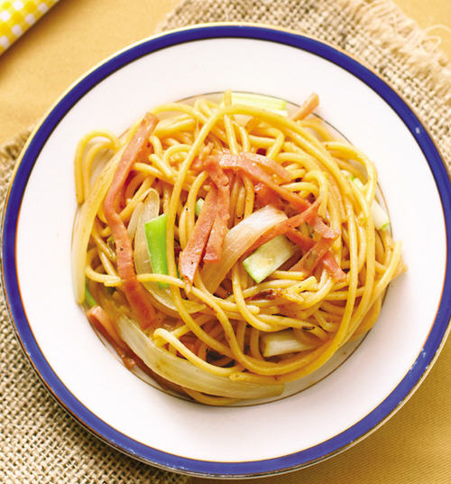 乌龙面 150公克、洋火腿 30公克、洋葱 1/4颗、绿豆芽 20公克、干香菇 15公克、韭黄 10公克、沙拉油 1大匙