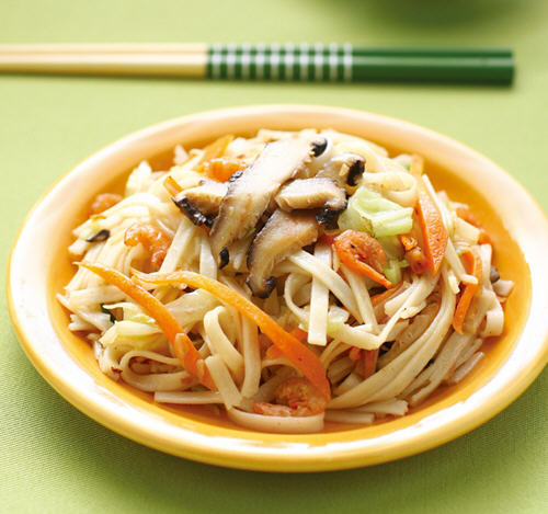 3、热一油锅,倒入沙拉油烧热,放入水、所有调味料、大地鱼粉、作法2的香菇丝及作法1伊面条一起拌炒均匀后,改转中火煮至汤汁收干。