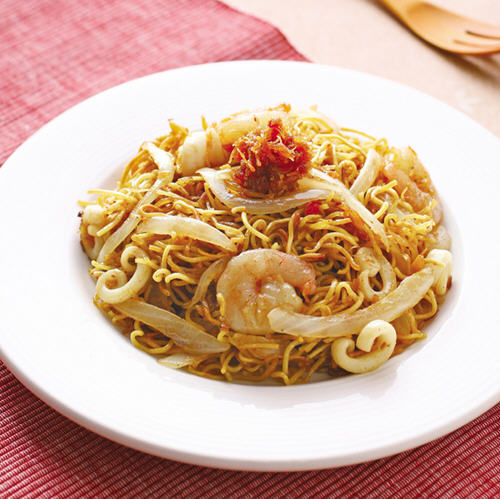 4、于作法3锅内放入面条、所有调味料和水,一起拌炒至汤汁收干即可。