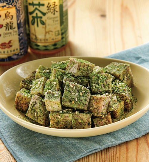 4、然后取出,在芋头丁上刷上薄薄橄榄油,撒上海苔风味粉,再放回烤箱,以上下火150/150℃,烤约10~15分钟至外酥内软即可。