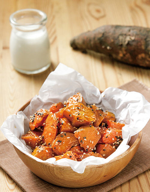 地瓜 1条、橄榄油 适量、细砂糖 75公克、水 25公克、熟黑、白芝麻 5公克
