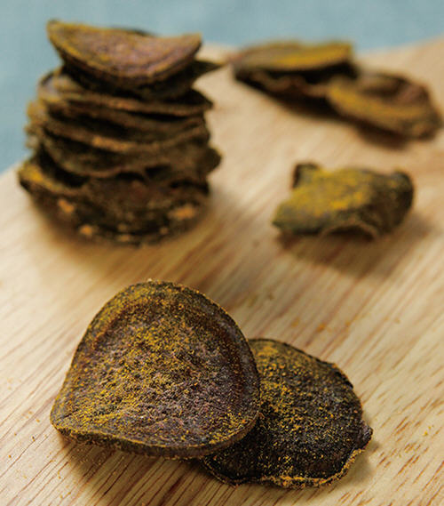 4、然后取出,在紫地瓜片上刷上薄薄橄榄油,撒上盐、咖哩粉、胡椒粉,再放回烤箱,以上下火150/150℃,烤约10~15分钟至金黄酥脆即可。