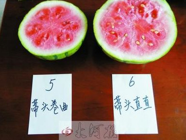 西瓜头,就是所谓的蒂头,若是直直的一条线,就不甜,但若是卷曲圈起来的,就很甜。