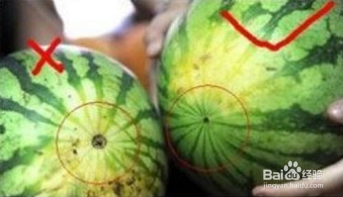 西瓜的好坏生熟,好吃与不好吃,可以从西瓜底部的圈圈判断,圈圈越小越好,相反的,底部圈圈越大,皮越厚,越难吃。(见图片)