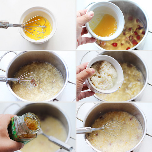 3.鸡蛋打散倒入锅中,拌匀关火然后倒入酒酿搅拌均匀即可,食用前根据个人口味调入糖桂花。