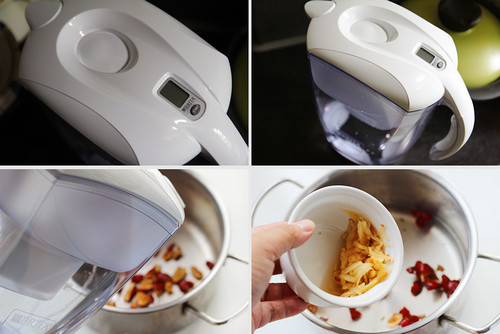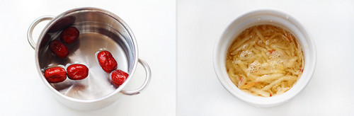 2.锅中加入洗净打大枣,倒入500ML过滤水,并加入苹果丝熬煮30分钟。家庭做汤还是建议大家使用过滤水,城市自来水的味道实在太重了,严重影响汤的品质。