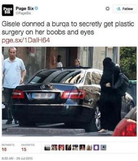 巴西前超模吉赛儿(Gisele Bündchen),在本月中被拍到全身穿着黑色伊斯兰教罩袍,到法国巴黎一间诊所就医。就有消息指出,吉赛儿可能是要秘密抢救下垂奶,于是穿着宽松的黑色罩袍前往整形诊所。