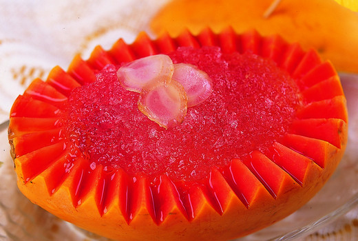 1、先将木瓜洗净外皮,用刀剖开,去除内核,用汤匙挖出木瓜肉,备用。