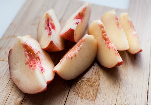 1、水蜜桃去核切成8片。