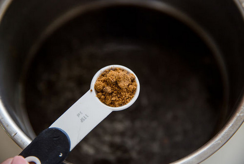 2、将糖、蜂蜜、水搅拌至糖完全溶解。