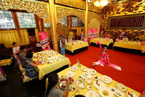 一家就坐后,随着太监妆扮的男服务员一声长喝“七夕宫廷晚宴正式开宴”,宴会厅响起悠扬琴音,婀娜的宫女伴随琴音表演惊鸿舞。而于此同时,宫女也开始传菜上菜,太监扯高嗓音报出“满汉全席”的每一道菜名,“松鹤延年、盈盈水间、四海求凰、犹抱琵琶、年年有余、翡翠龙钱、一品官燕……”