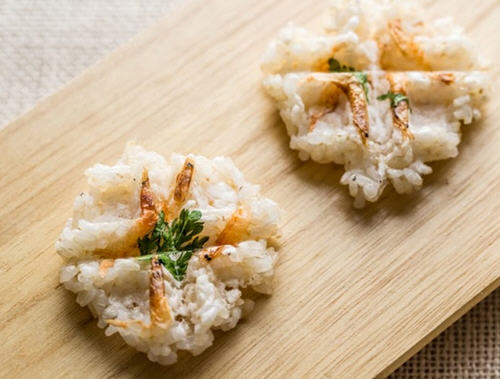 2、饭团稍稍压平后,在上方放置4只樱花虾和2小片香菜,并撒上少许海盐。