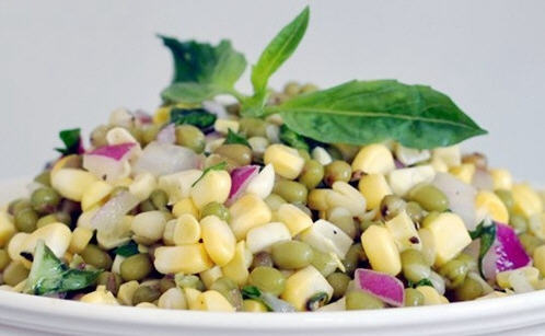 还有一款玉米绿豆沙拉,原料有玉米粒,绿豆、红洋葱、蒜蓉、罗勒叶、欧芹末、橄榄油、苹果醋、盐和胡椒,绿豆煮熟冷却后,所有原料拌在一起就可以。这道沙拉夏天吃口感非常清爽的。
