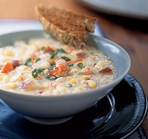 玉米经常用来做汤,最多用在周打(Chowder,杂烩)汤里,常见的两款有玉米虾仁和玉米鸡肉周打汤,其它配料都一样,通常用洋葱、胡萝卜和土豆,汤料一般用奶油或兑稀后的白汁,也可以一半一半,以此为主可以变化出各种其他的玉米浓汤,一碗汤加上面包片就可以是简单的一餐了了。