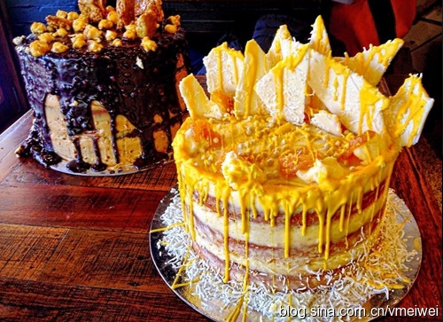 (6月1号,右边是椰子戚风蛋糕配柠檬酱,左边是香草巧克力蛋糕配花生酱奶糖。有点那个劲儿了。83人点赞。图片来自网络)